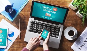 Online shopping website on laptop screen with female hands using a smartphone